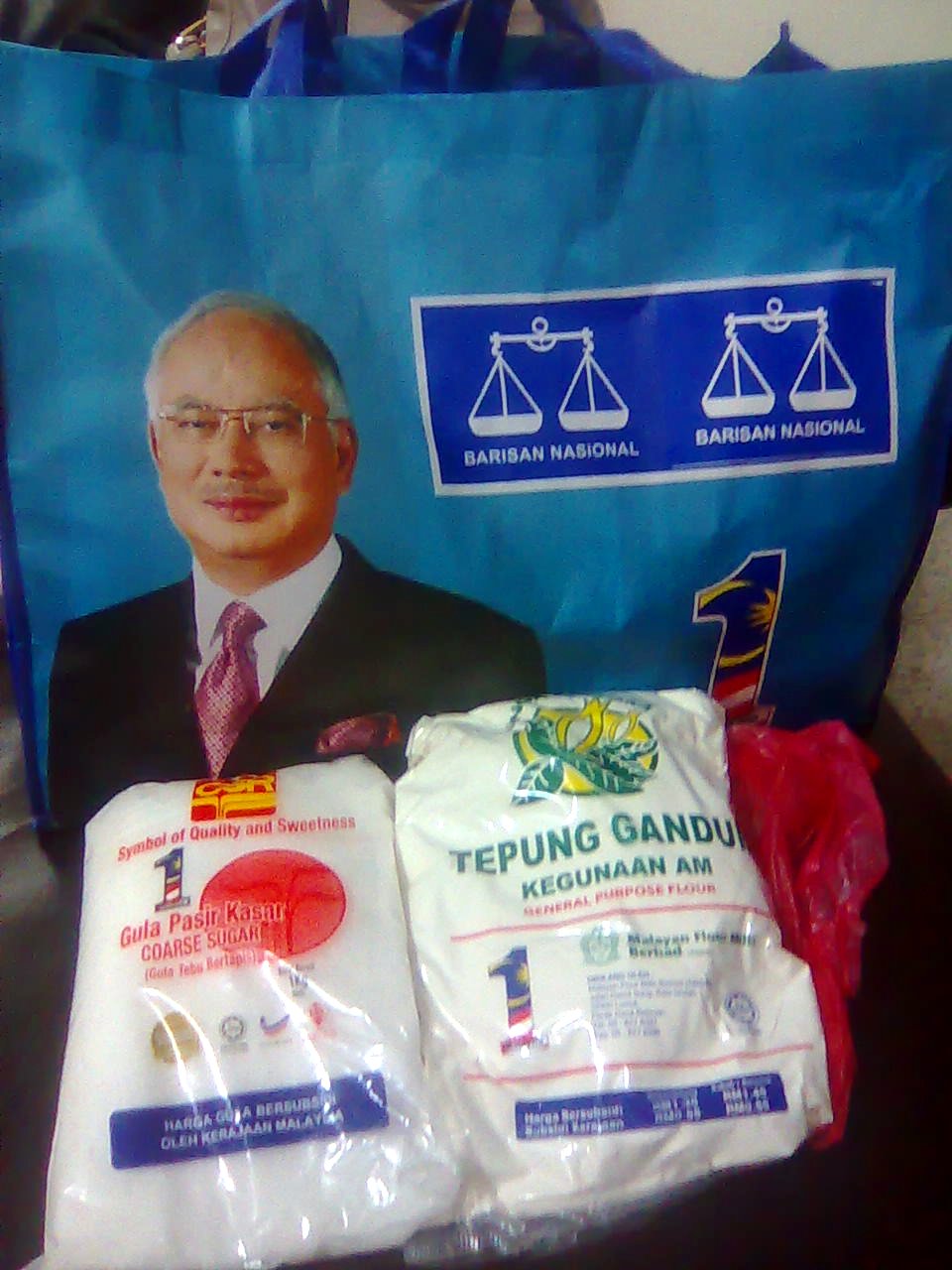 Eight bags of sugar and eight bags of flour were given out to each person. That’s how I ended up having a photo of these commodities. These were all stuff into large blue carrier bags bearing the handsome portrait of our current Prime Minister and the logo of Barisan Nasional.